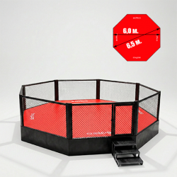 Клетка для боев без правил 6,50 метров в диаметре на помосте. Помост не выступает за габариты сетки. Форма клетки и помоста - восьмиугольник. В таких клетках проводят международные соревнования и тренировки любого уровня.