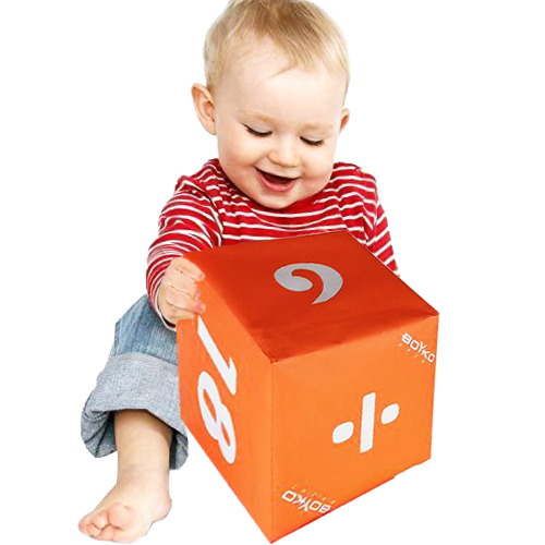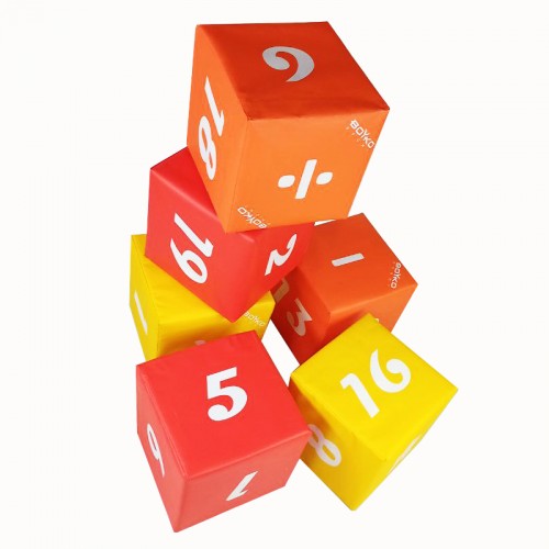 Набор из шести мягких кубиков с цифрами от 1 до 20 и математическими символами "+", "-", ":", "x", "=", ">".