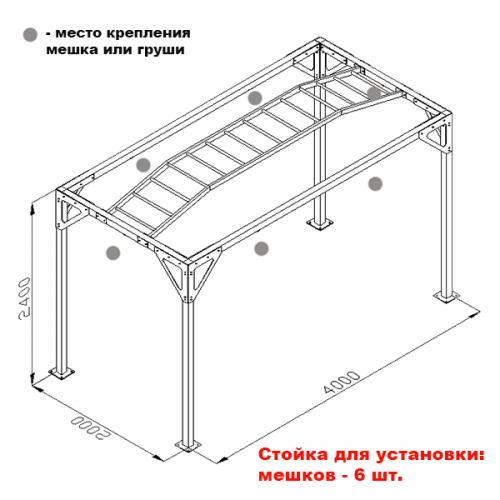 Стойка для боксерских мешков профессиональная №4 с рукоходом (на 6 мешков (по периметру)) (Ш:Д:В): 2,0:4,0:2,6 м.